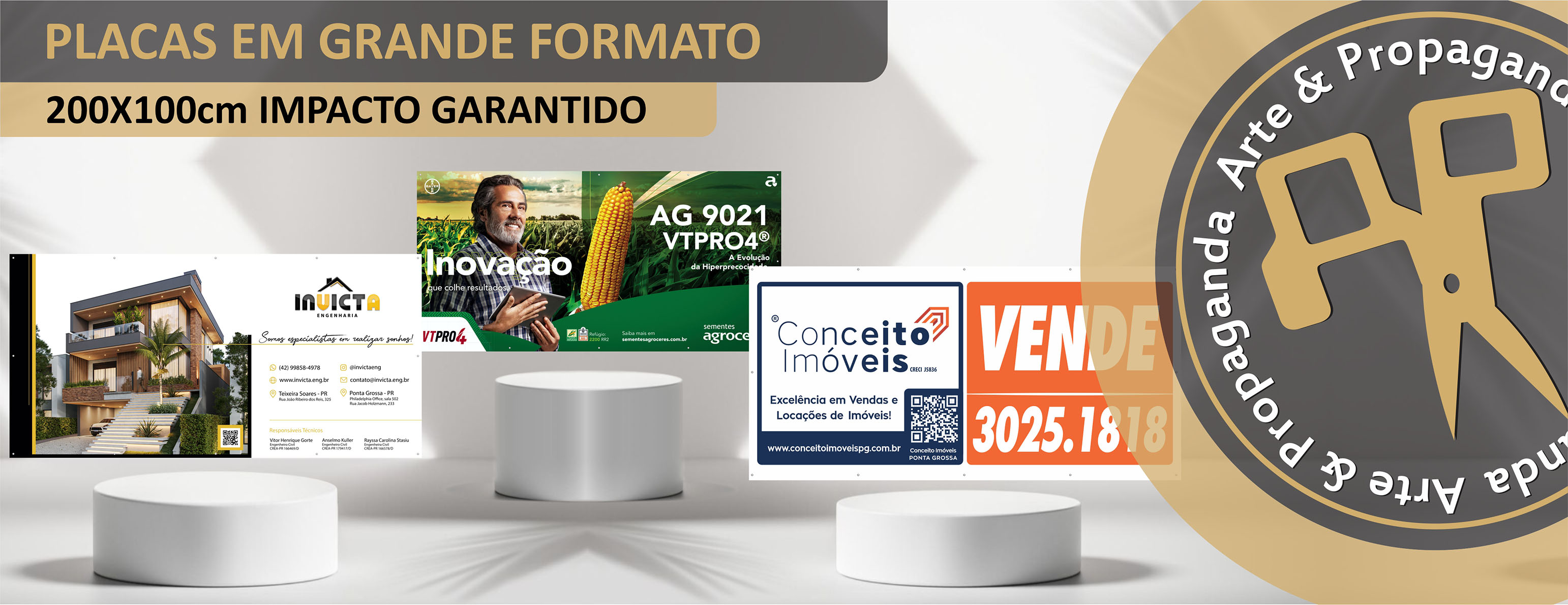 Placas em grande formato são uma eficiente ferramenta de marketing para divulgar marcas, produtos e serviços. Fabricadas com polionda de alta qualidade, essas placas proporcionam visibilidade constante e impacto visual para milhares de pessoas. Entre em contato com nosso departamento comercial acertando em cheio com essa escolha, impulsionando ainda mais o seu sucesso.